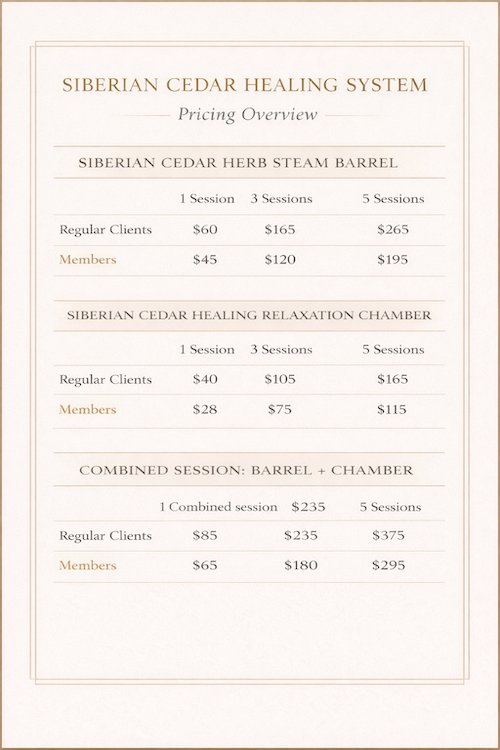 Healing transformational sessions in the Siberian cedar herb steam barrel and the Siberian cedar healing relaxation chamber